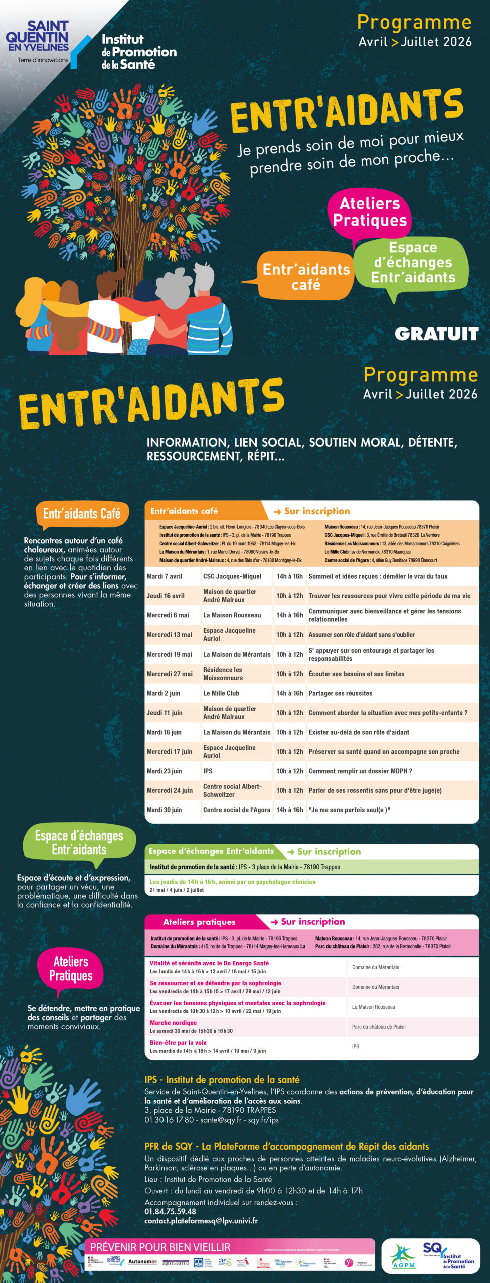 Toute l’année, l’Institut de Promotion de la Santé (IPS) de Saint-Quentin-en-Yvelines en partenariat avec la PlateForme de Répit des aidants de Grand Versailles – Saint-Quentin-en-Yvelines (portée par l’Hôpital la Porte Verte) organisent des rencontres gratuites et proposent un guichet de proximité pour venir en aide aux à l’entourage des personnes confrontées à la maladie ou au handicap, ou en soins palliatifs